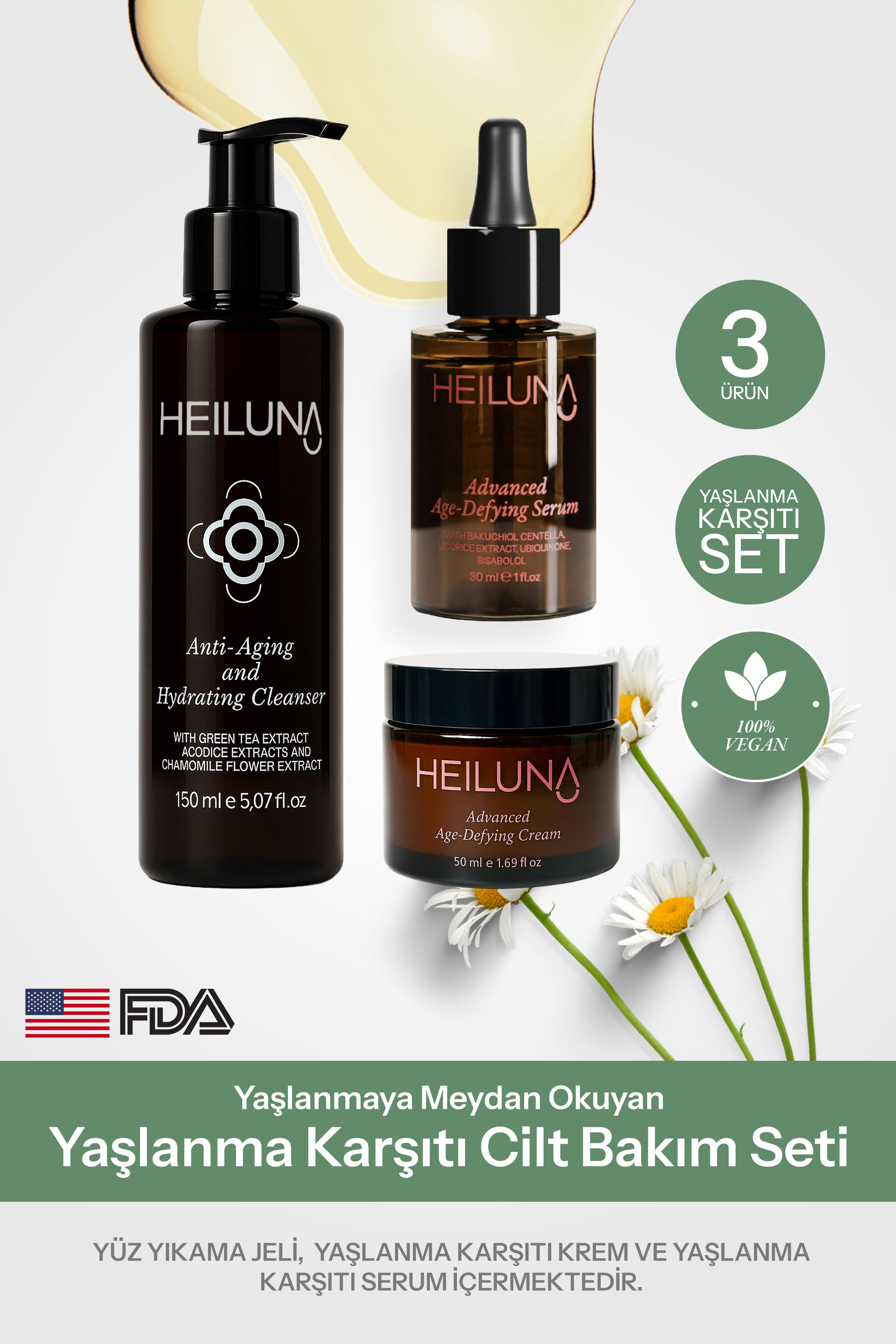 Heiluna Yaşlanma Karşıtı Cilt Bakım Seti, cildinizi derinlemesine temizleyen, yaşlanma belirtilerini hedefleyen ve nem dengesini koruyan üç özel üründen oluşur.